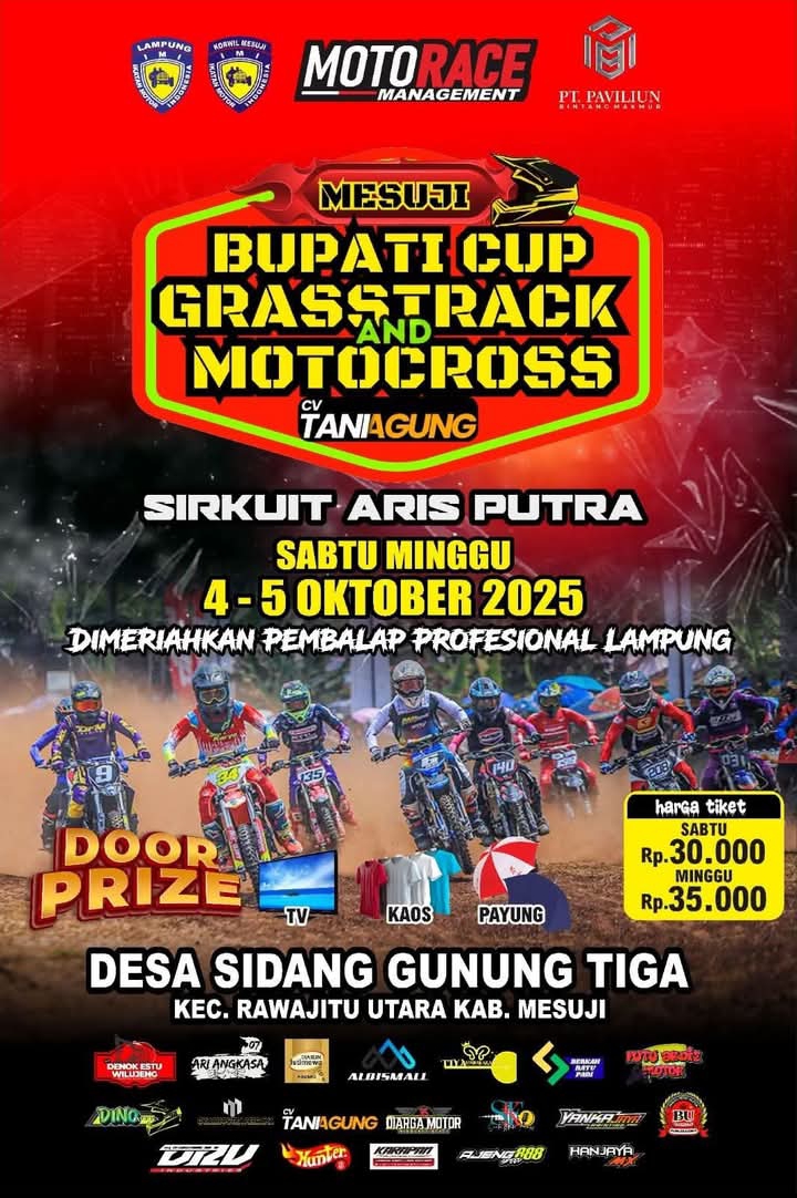 Otoritas-News.com // Mesuji, Lampung – Para pecinta motorcross dan grasstrack, bersiaplah! Bupati Cup Grasstrack dan Motocross Mesuji akan segera digelar di Sirkuit Aris Putra pada tanggal 4-5 Oktober 2025. Acara ini menjanjikan aksi yang mendebarkan dan persaingan sengit dari para pembalap profesional Lampung.